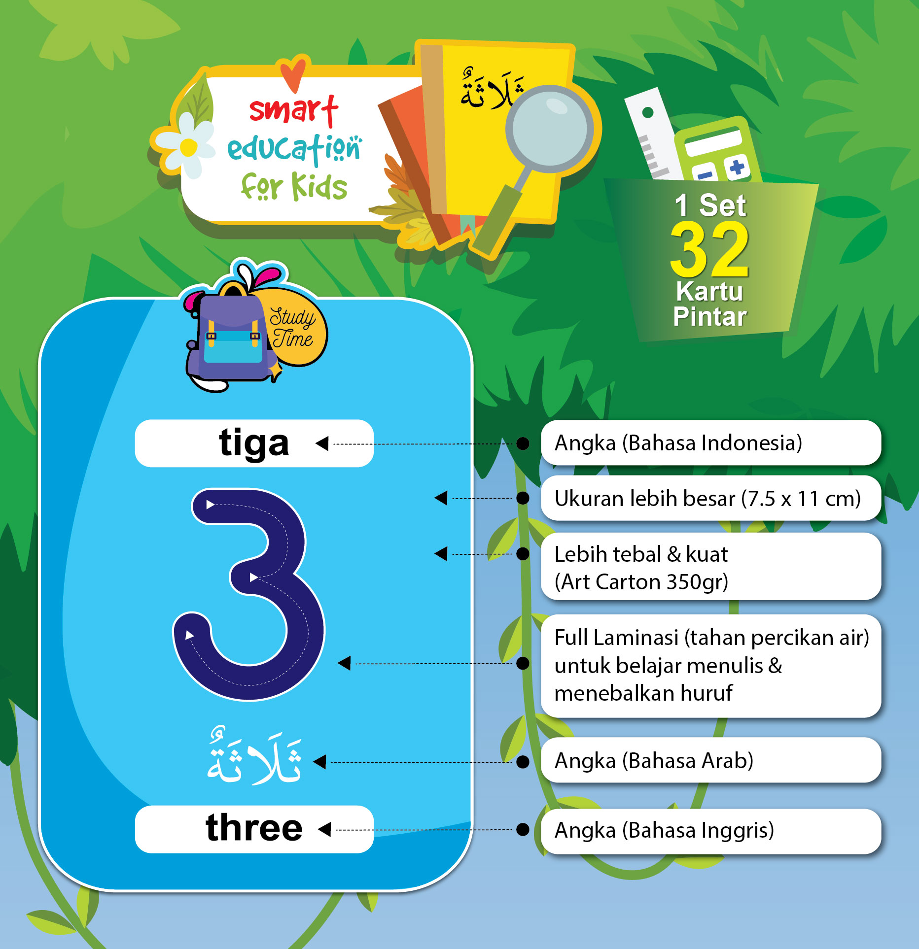 Kartu pintar yang dapat mengenalkan anak kita tentang pembelajaran Angka (3 Bahasa), Kisah Para Nabi, Rukun Islam, manfaat dari menggunakan mainan edukasi anak ini adalah dapat membantu meningkatkan kreativitas dan imajinasi anak, serta membantu mengembangkan kemampuan kognitif dan motorik anak.